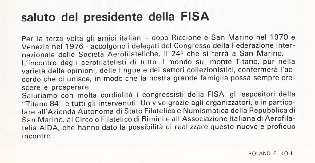 Grazie alla generosa ospitalità dell’Azienda Autonoma di Stato Filatelica e Numismatica della Repubblica di San Marino, che mise a disposizione gli spazi del Palazzo dei Congressi, fu possibile ospitare anche il 24° congresso della Federazione Internazionale delle Società Aerofilateliche (FISA).