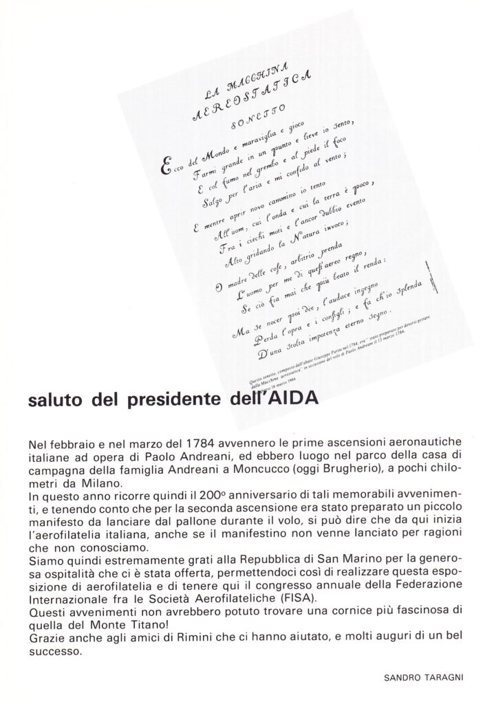 Grazie alle grandi capacità organizzative del Presidente Sandro Taragni ed all’appoggio del Circolo Filatelico di Rimini, venne organizzata nella Repubblica di San Marino questa grande esposizione filatelica, con la quale veniva commemorato il Bicentenario delle prime ascensioni aeronautiche italiane ad opera di Paolo Andreani, avvenute nel 1874, a pochi chilometri da Milano.