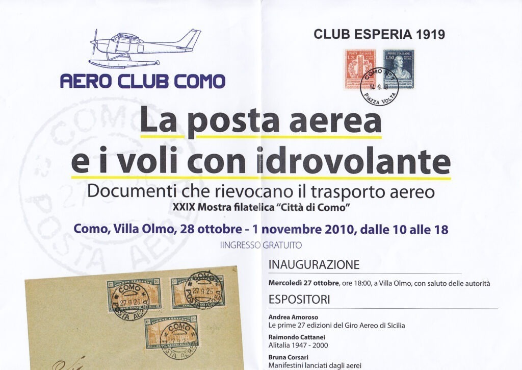 La Mostra di Como venne realizzata dal Club Esperia con a capo il nostro socio Oliviero Emoroso. Nei lussuosi locali di Villa Olmo, sede di rappresentanza del Comune, i soci Andrea Amoroso, Raimondo Cattanei, Bruna Corsari, Eligio Di Mento, Alberto Freda, Costantino Gironi, Giovanni Merelli, Carlo Milanesi,  Flavio Riccitelli e Massimo Trenta hanno presentato interessanti collezioni che davano un quadro completo dei vari settori dell’aerofilatelia. Molto interesse anche per il settore memorabilia, presentato dal Club Esperia.
