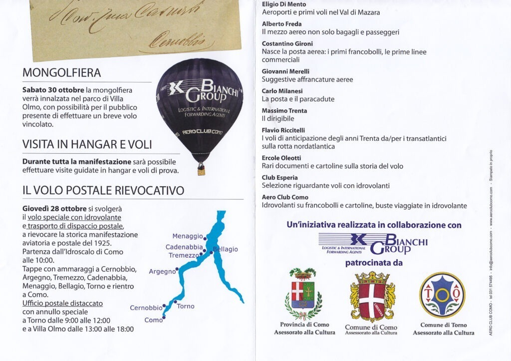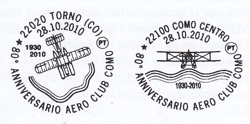 Il 28 ottobre sono stati attivati due Uffici Postali Distaccati, a Torno ed a Como (quest’ultimo presso la sede della Mostra), con due annulli dedicati all’80° anniversario di fondazione dell’Aero Club lariano con cui sono state obliterate le affrancature delle cartoline ricordo.