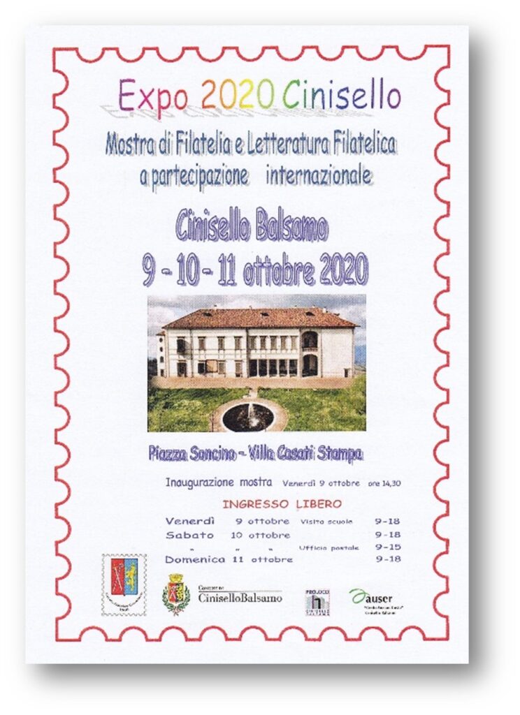 Nonostante la pandemia, nei giorni 9-11 ottobre 2020, a Cinisello Balsamo, nella splendida cornice della villa Casati Stampa, si è tenuta la Mostra Filatelica e Letteratura Filatelica a partecipazione internazionale EXPO2020 CINISELLO, organizzata all’interno degli eventi della sagra del balsamo.