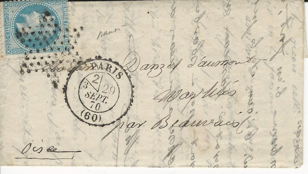 Parigi, all’epoca dell’assedio prussiano, è la capitale europea più popolata con i suoi 2 milioni di abitanti; oltre alla posta centrale, vi sono 39 uffici postali di quartiere, 19 di periferia entro le mura ed 8 fuori le mura, ancora controllati dai francesi.