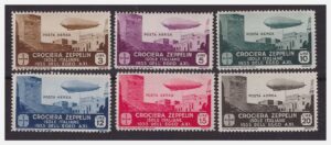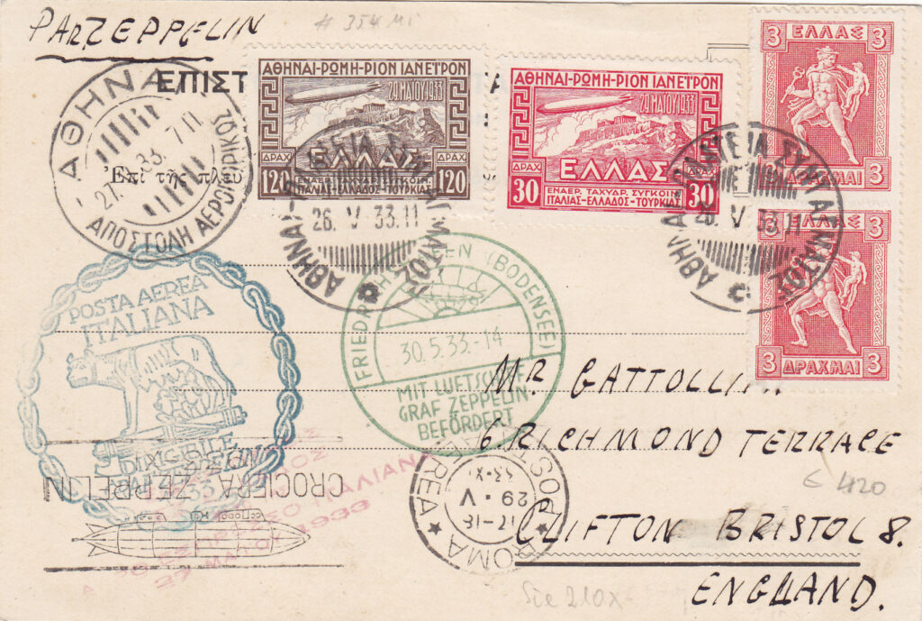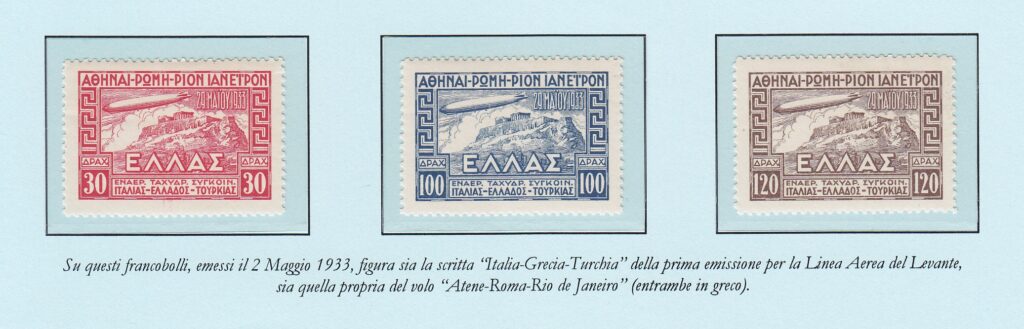 Altrettanto fecero la Repubblica di San Marino e la Grecia, quest’ultima con una serie di tre francobolli (da 30, 100 e 120 Dracme). I nuovi francobolli emessi erano validi esclusivamente per affrancare la corrispondenza da trasportare nel viaggio di ritorno in Germania e quello che il dirigibile si accingeva a fare di lì a poco in Sudamerica. Il loro valore corrispondeva esattamente alla soprattassa per il trasporto Zeppelin. Ad essi si accompagnava l’affrancatura ordinaria per supplire alle normali tasse per l’interno o per l’estero.