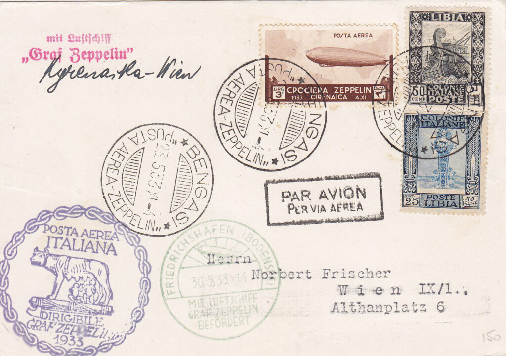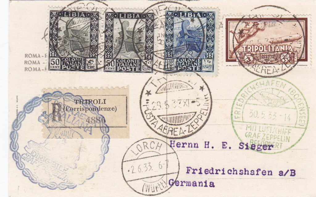 Da quanto sopra esposto si può logicamente affermare che gli aerogrammi recanti al retro il timbro lineare a macchina del giorno 30 maggio (anzichè del 29 maggio), facciano parte del corriere spedito il giorno successivo. Peraltro, osservando attentamente la corrispondenza, si può constatare come gli aerogrammi sui quali è stato applicato il timbro di cui sopra, provengano quasi tutti dalla Tripolitania e su di essi i francobolli speciali zeppelin risultino essere obliterati con il timbro “TRIPOLI / 29.5.33 / POSTA AEREA ZEPPELIN”, quando invece gli aerogrammi, sempre provenienti dalle Colonie, recanti il timbro lineare a macchina del 29 maggio 1933, risultino timbrati in partenza con date sempre anteriori al 29 maggio, e quindi arrivati a Roma in tempo utile per essere imbarcati sul dirigibile. Si tratta quindi, con ogni probabilità, di un corriere supplementare, costituito da corrispondenza diretta in Europa ed in Sudmerica. Per quest’ultima l’imbarco sul dirigibile è sicuramente avvenuto dopo il suo arrivo a Friedrichshafen.