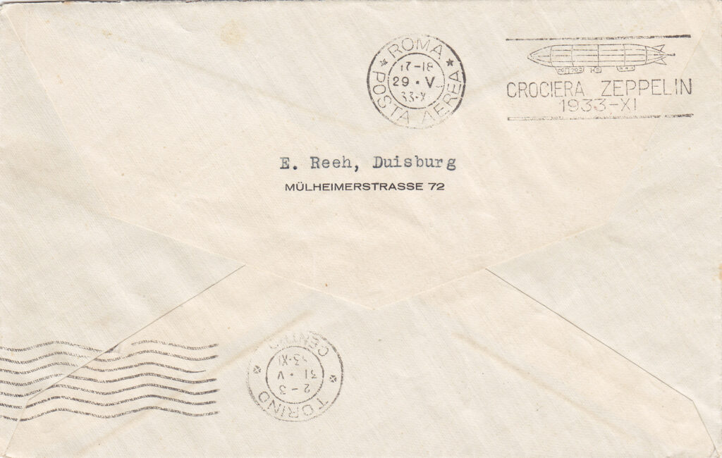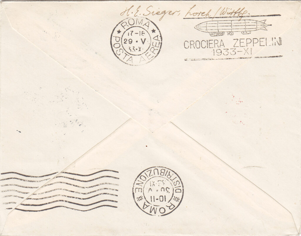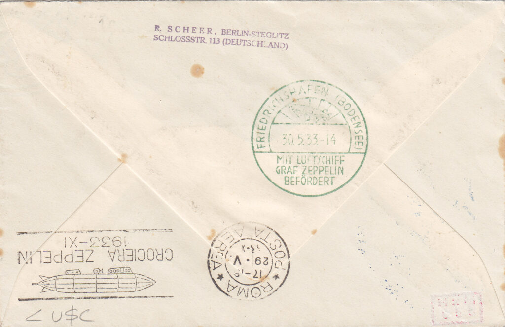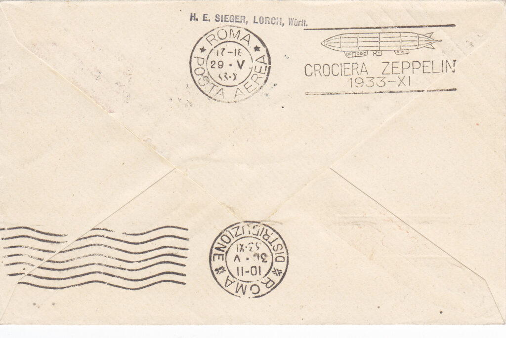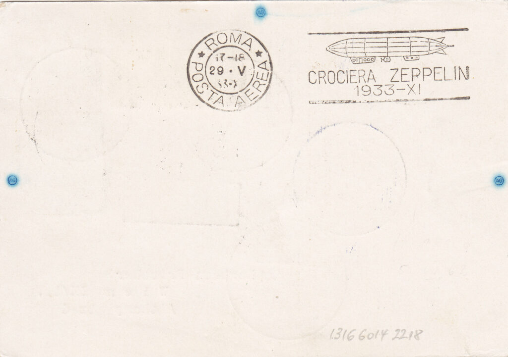 In arrivo a Roma, sia sulla corrispondenza proveniente dalla Germania con il dirigibile, sia su quella in procinto di essere imbarcata sullo stesso, venne apposto il timbro meccanico “ROMA / POSTA AEREA / 17-18 / 29-V / 33-XI”, al quale per l’occasione era stata aggiunta una targhetta con la sagoma stilizzata del dirigibile e la dicitura “CROCIERA ZEPPELIN / 1933 – XI”. Su una parte non numerosa di corrispondenza lo stesso timbro è presente anche con data 30.5.33. (4)