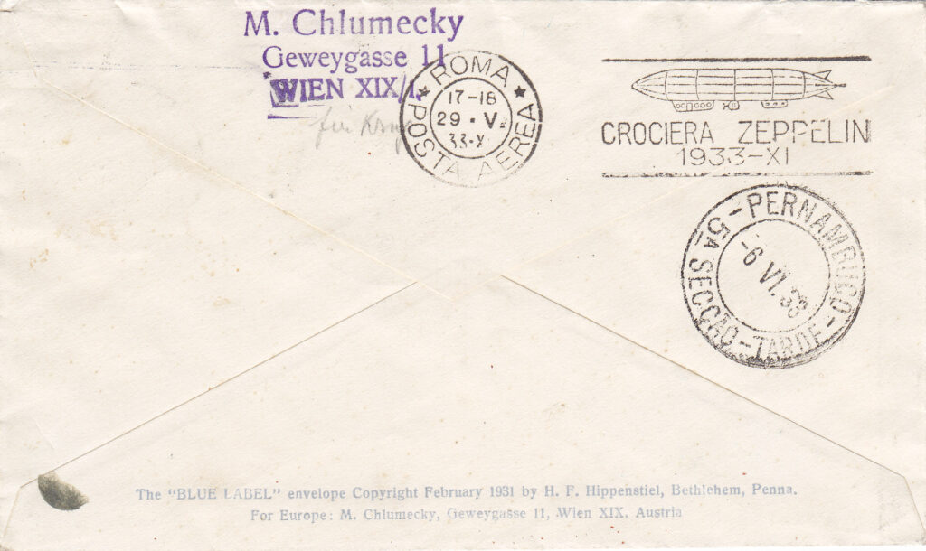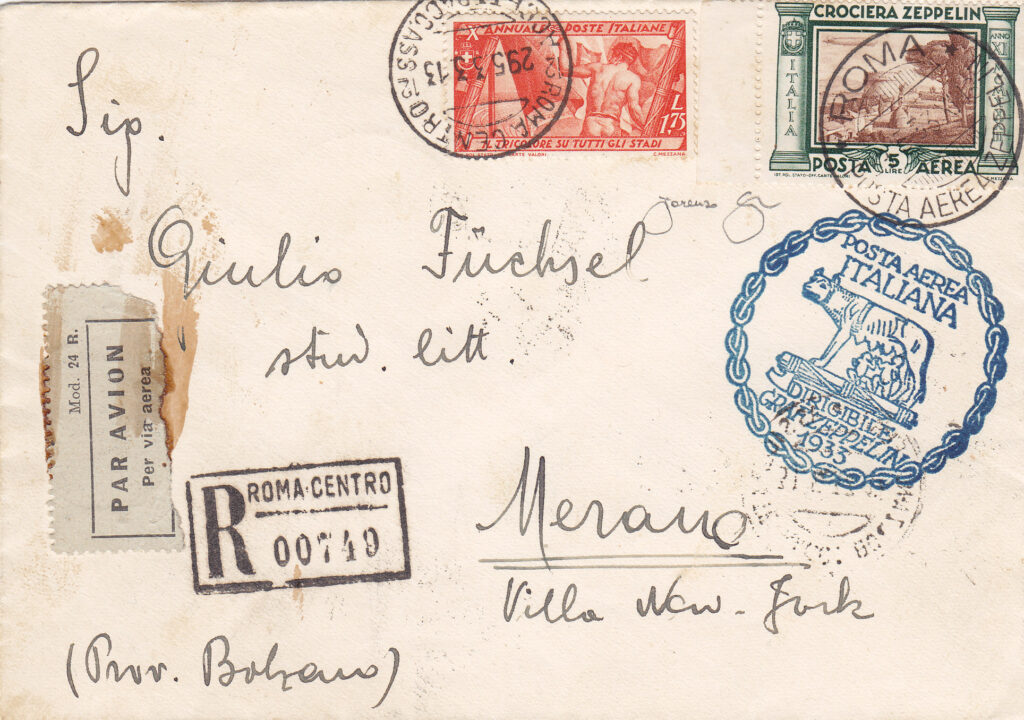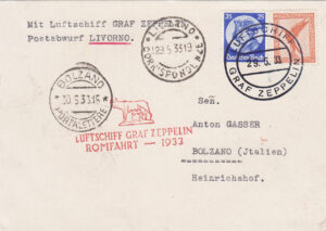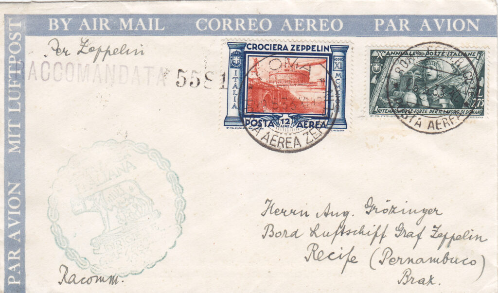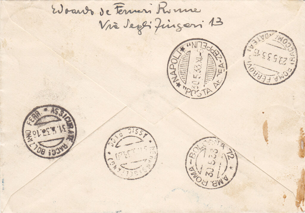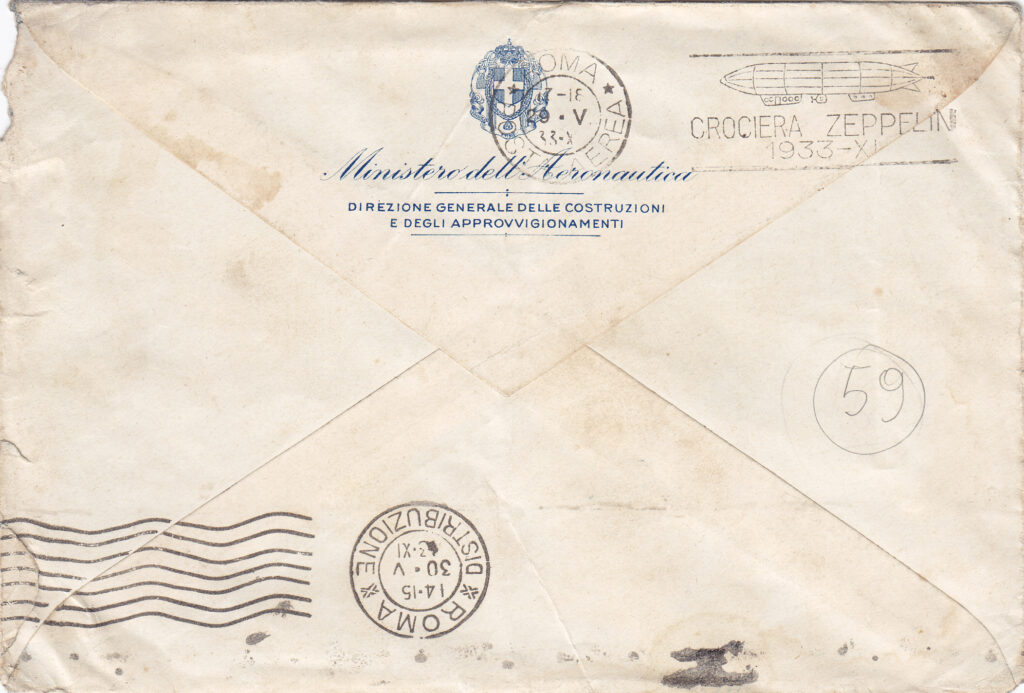 In arrivo a Roma, sia sulla corrispondenza proveniente dalla Germania con il dirigibile, sia su quella in procinto di essere imbarcata sullo stesso, venne apposto il timbro meccanico “ROMA / POSTA AEREA / 17-18 / 29-V / 33-XI”, al quale per l’occasione era stata aggiunta una targhetta con la sagoma stilizzata del dirigibile e la dicitura “CROCIERA ZEPPELIN / 1933 – XI”. Su una parte non numerosa di corrispondenza lo stesso timbro è presente anche con data 30.5.33. (4)