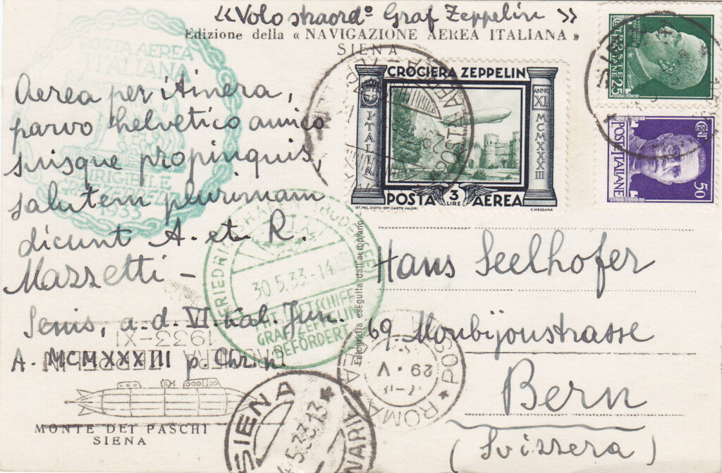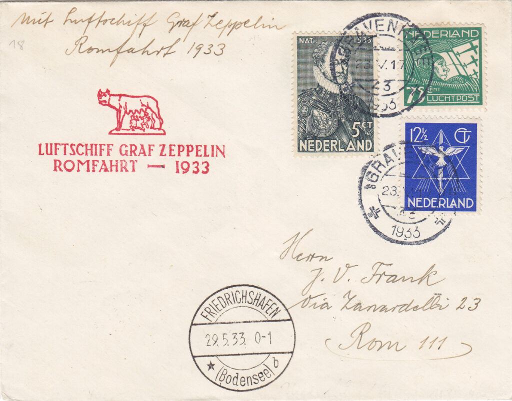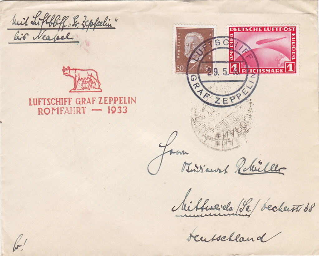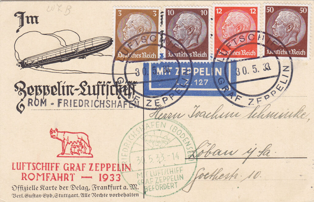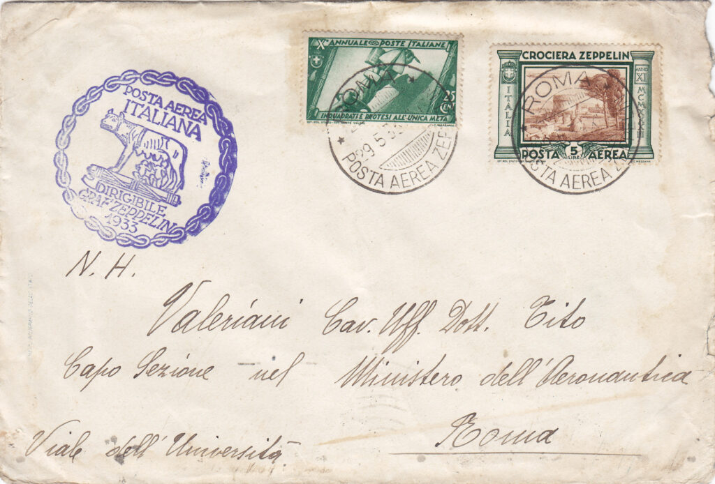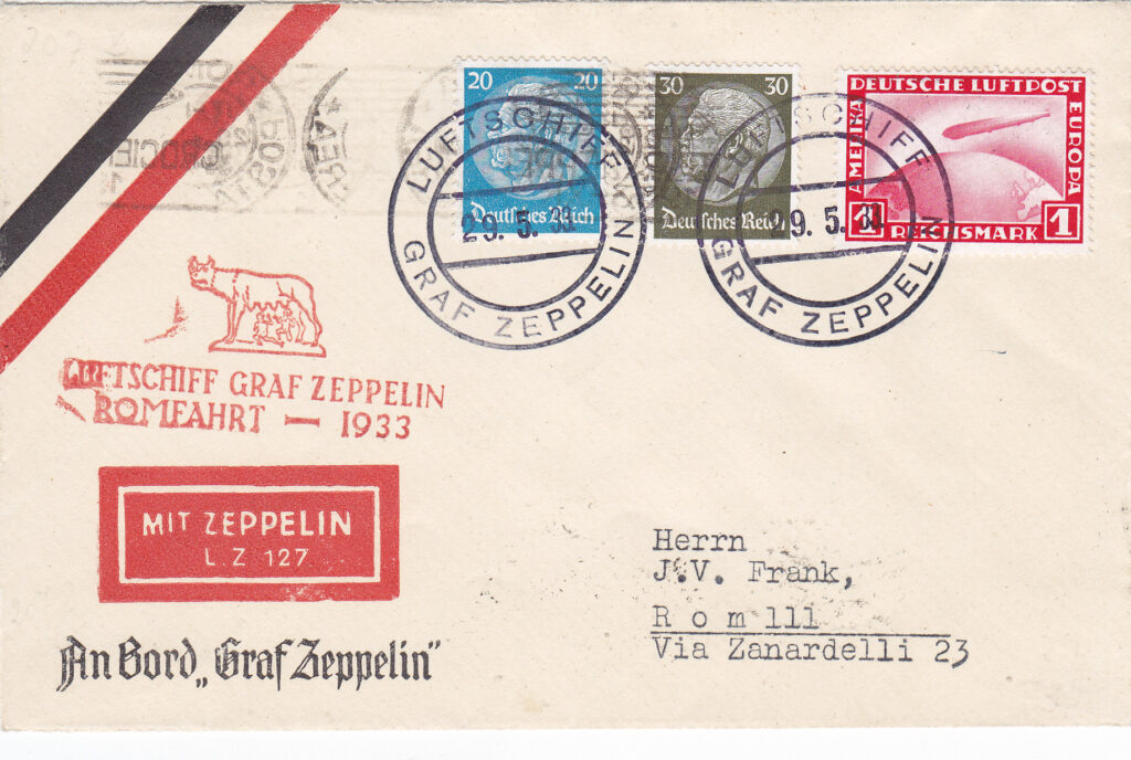 Il breve viaggio a Roma del dirigibile Zeppelin LZ.127 “Graf Zeppelin”, effettuato nel maggio del 1933, prima di iniziare il secondo viaggio dell’anno nel Sudamerica, come i tanti altri compiuti in Europa e nel Mediterraneo negli anni trenta, contribuì a tenere viva l’attenzione dell’opinione pubblica mondiale su questo mezzo di trasporto ed in particolare sul “Graf Zeppelin”, che aveva iniziato una lunga serie di voli commerciali regolari per il Sudamerica, con trasporto di passeggeri, merci e posta. All’epoca il trasporto postale non era meno importante del trasporto passeggeri e merci e da esso derivavano entrate vitali per la Compagnia Zeppelin, come dimostrato dalla molta attenzione che veniva data ai filatelisti, la cui corrispondenza trasportata con il dirigibile, oltre ai normali annullamenti postali riceveva una timbratura speciale differente, a seconda del volo. Lo stesso avvenne per il viaggio a Roma, la cui finalità fortemente propagandistica era messa in risalto dalla presenza nella capitale italiana del Ministro delle Propaganda del Reich, Goebbels.