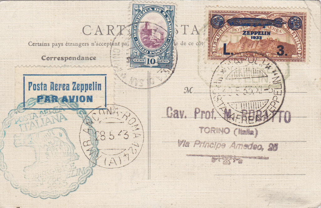 Si trattava di un corriere eccezionalmente numeroso, una parte del quale venne spedito il giorno successivo (30 maggio 1933) per ferrovia o per posta aerea ordinaria a Friedrichshafen, tenuto conto che la partenza per il Brasile era fissata per il 3 giugno (5). Tale circostanza si può spiegare se si tiene conto del fatto che l’ufficio postale di Roma, prima iniziare ad annullare la corrispondenza, volle attendere la conferma telegrafica che il dirigibile era partito da Friedrichshafen. Ciò che avvenne poco prima della partenza. Ebbene, considerando che il dirigibile ripartiva da Roma alle 19.45 del giorno stesso, il tempo a disposizione non era certamente sufficiente ad effettuare la bollatura di tutta la corrispondenza in quella giornata. Questo spiega anche perché i francobolli Zeppelin italiani, nella generalità dei casi, siano stati annullati in data 29 maggio 1933 e più raramente con date precedenti. Inoltre, vista la grande quantità di posta da smaltire, si comprende come molte corrispondenze siano state annullate in partenza con il timbro meccanico anziché con il timbro circolare e altre, nella maggior parte dei casi il corriere proveniente da San Marino e destinato in Sudamerica, siano addirittura sprovviste del grande timbro speciale italiano. In quest’ultimo caso si sono avuti un esiguo numero di aerogrammi atipici, ma la circostanza ha anche fornito l’occasione per la produzione di falsi.