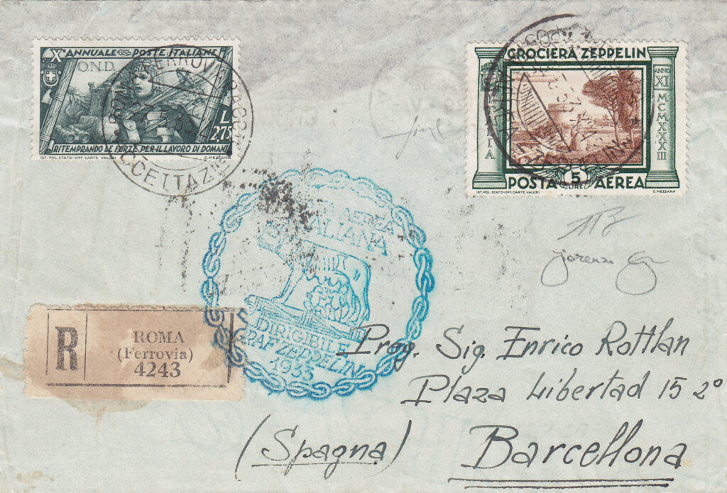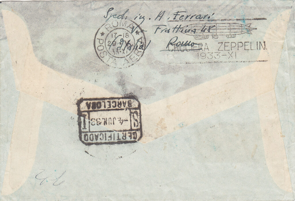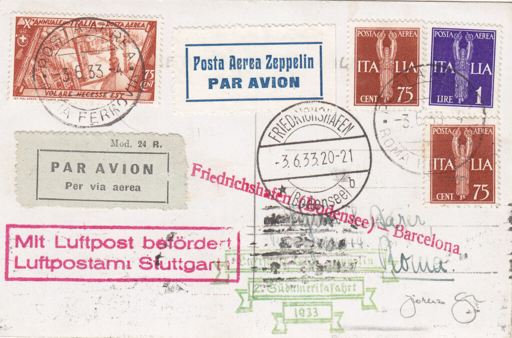 La cartolina della foto (al retro della quale vi è una foto del dirigibile che sorvola Roma, più precisamente Piazza di Spagna), che fa parte del corriere lanciato su Barcellona (via Friedrichshafen), presenta la particolarità di essere stata spedita il 3 giugno 1933, quindi dopo la partenza del dirigibile da Roma, ed aver raggiunto la base di Friedrichshafen (via Stoccarda) a tempo di primato, in tempo utile per essere imbarcata sul dirigibile e lanciata successivamente su Barcellona. Essa è munita di tutti i timbri di viaggio cui era destinata (6).