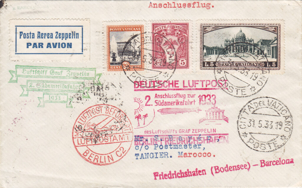 Per i dispacci provenienti dalla Città del Vaticano era obbligatoria l’affrancatura mista, non avendo questo paese sottoscritto la convenzione postale con la Germania. I francobolli del Vaticano erano utilizzati come tariffa ordinaria ed i francobolli Zeppelin italiani come soprattassa aerea per il trasporto con il dirigibile. I primi erano obliterati con il timbro ordinario delle Poste Vaticane ed i secondi dalle Poste Italiane, con il timbro speciale a data “Roma – Posta Aerea Zeppelin”.