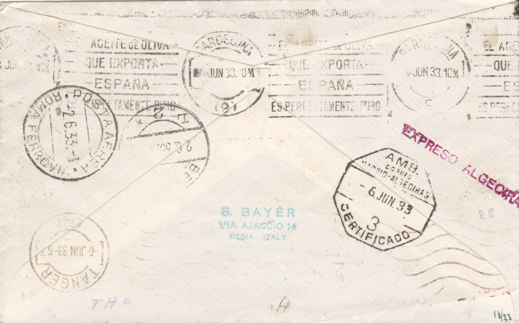 Oltre che dai paesi dell’area italiana (San Marino, Isole dell’Egeo, Tripolitania, Cirenaica, Eritrea e Vaticano) e dalla Grecia (via Aero Espresso) giunsero a Roma corrispondenze provenienti anche da altri paesi, per i quali esisteva già una convenzione postale con la Germania. Del corriere fanno quindi parte aerogrammi provenienti anche dal Liechtenstein, dalla Svizzera, da Malta, dalla Siria, da Lattaquie e dal Libano. Come tutta la posta partita da Roma, anche su di essi venne applicato il grande timbro speciale italiano di colore azzurro.