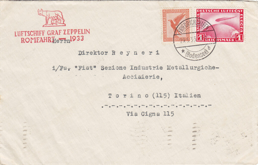 Pur brevissimo, il viaggio a Roma del dirigibile Zeppelin LZ.127 “Graf Zeppelin” riveste una particolare importanza nell’ambito del grande universo della posta zeppelin, e questo per diverse ragioni. Innanzitutto per la grande quantità e varietà di documentazione filatelica prodotta. E poi, a differenza dei precedenti viaggi in Italia (in occasione dell’Orientfahrt, con lancio postale su Roma e del Mittelmeefahrt, con lancio postale su San Remo, entrambi effettuati nel 1929), in questa occasione il “Graf Zeppelin” per la prima volta atterrava su suolo italiano. All’avvenimento venne data grande importanza da parte del regime fascista, che coglieva ogni occasione per attrarre sul nostro paese l’attenzione dell’opinione pubblica mondiale. Ed in effetti, nessun precedente viaggio dello Zeppelin era stato ricordato con l’emissione contemporanea di così tanti francobolli, ben 33. Peraltro, il 1933, fu un anno denso di grandi avvenimenti aviatori per il nostro paese.