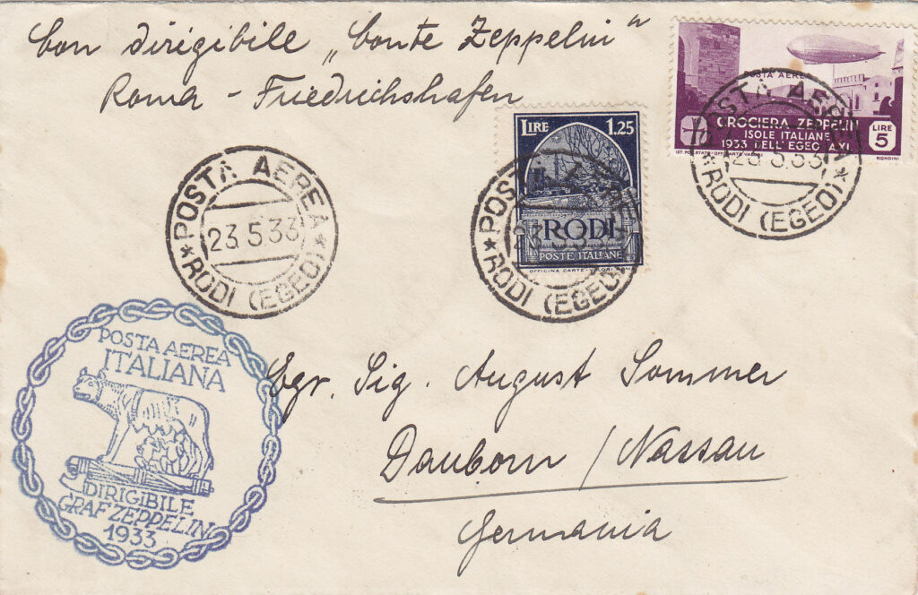 Diversamente da Tripoli e Bengasi, per la posta proveniente dalle Isole dell’Egeo non venne approntato alcun timbro speciale. Si utilizzò il timbro postale datario ordinario “POSTA AEREA / 24.5.33 / RODI / (EGEO)”, quale annullatore dell’intera affrancatura, anche dei francobolli speciali Zeppelin.