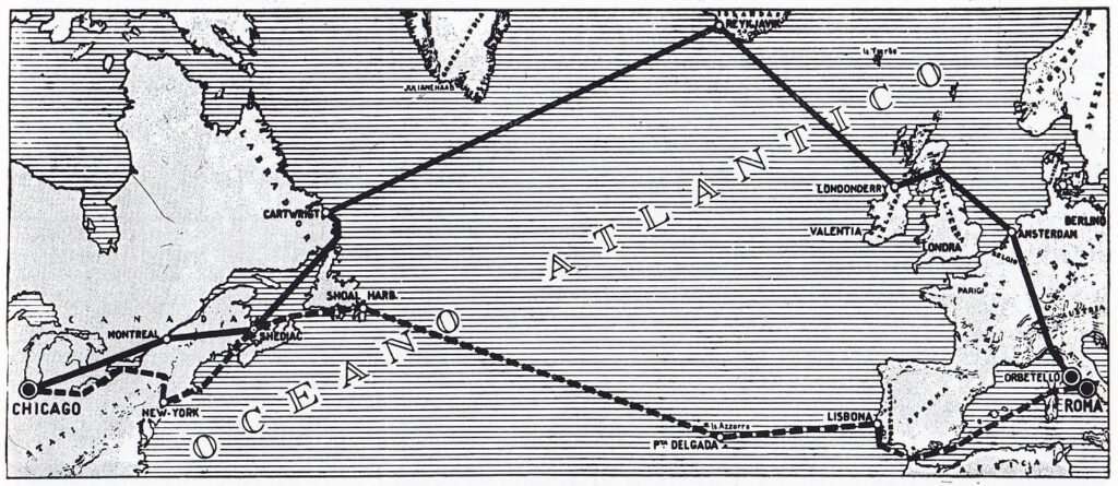 La squadra atlantica, formata da 25 idrovolanti S 55 X, suddivisi in otto squadriglie di tre velivoli ciascuna, più uno considerato di riserva, partì da Orbetello e rientrò a Roma, dopo aver compiuto un percorso di tredici tappe per un totale di circa 20.000 km., attraversando per ben due volte l’Oceano Atlantico.