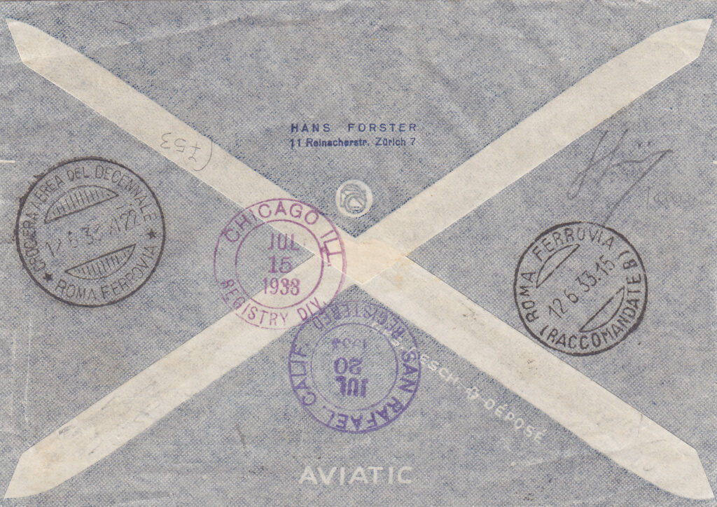 Dopo forzati rinvii e giorni di attesa, finalmente si parte. E,’ la mattina di sabato l’ luglio 1933. Tutta la corrispondenza destinata alle sedi di arrivo delle varie tappe é già a bordo degli idrovolanti fin dalla sera prima. Oltre alla posta di Italia e colonie, per complessivi 3.496 aerogrammi arriva un piccolo corriere dal Vaticano. Vi é anche un corriere costituito da poche lettere proveniente dalla Germania, raccolto a Monaco di Baviera e munito di un annullo in data 30 giugno, trasportato con un aereo a Roma.