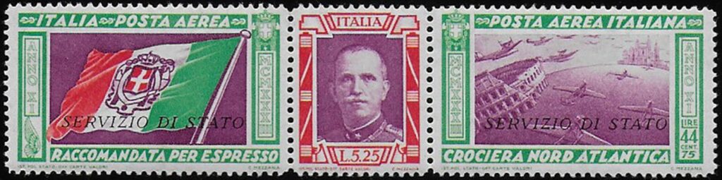 Per affrancare la corrispondenza delle autorità di Stato inviata in America viene emesso un francobollo speciale, sempre in trittico ma di colore diverso e con la sovrastampa: “Servizio di Stato”.