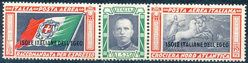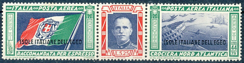 I francobolli per le Colonie, videro la luce successivamente e precisamente il 1 giugno; questi non sono a forma di trittico, ma hanno un’unica sezione che rappresenta solo la soprattassa aerea, pertanto la tariffa doveva essere integrata mediante aggiunta di francobolli di posta aerea od ordinari. Per le sole Isole dell’Egeo furono sovrastampati i due francobolli preparati per l’Italia, in colori però differenti e senza le sigle dei comandanti.
