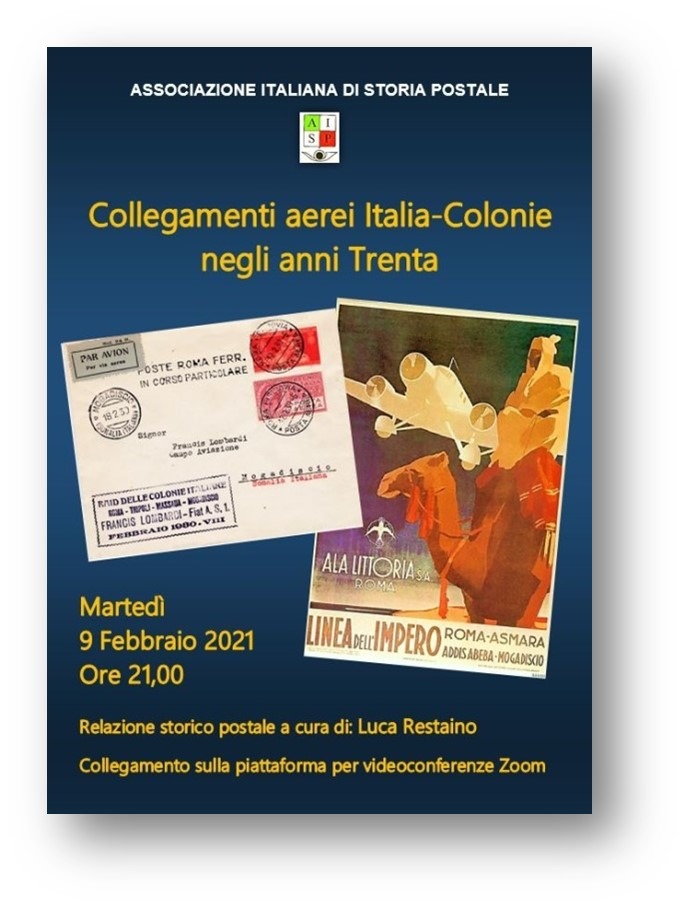 Nell’ambito del programma di conferenze a cadenza mensile organizzate dall’Associazione Italiana di Storia Postale, con la quale abbiamo un ottimo rapporto di collaborazione, tenute attraverso la piattaforma Zoom ed aperte a tutti, martedì 9 febbraio u.s. abbiamo assistito all’interessante relazione del nostro socio Luca Restaino dal titolo Collegamenti aerei Italia-Colonie negli anni Trenta. Una relazione ben strutturata, costituita da materiale molto interessante, con la quale Luca Restaino è riuscito a catturare l’interesse dei tanti presenti.
