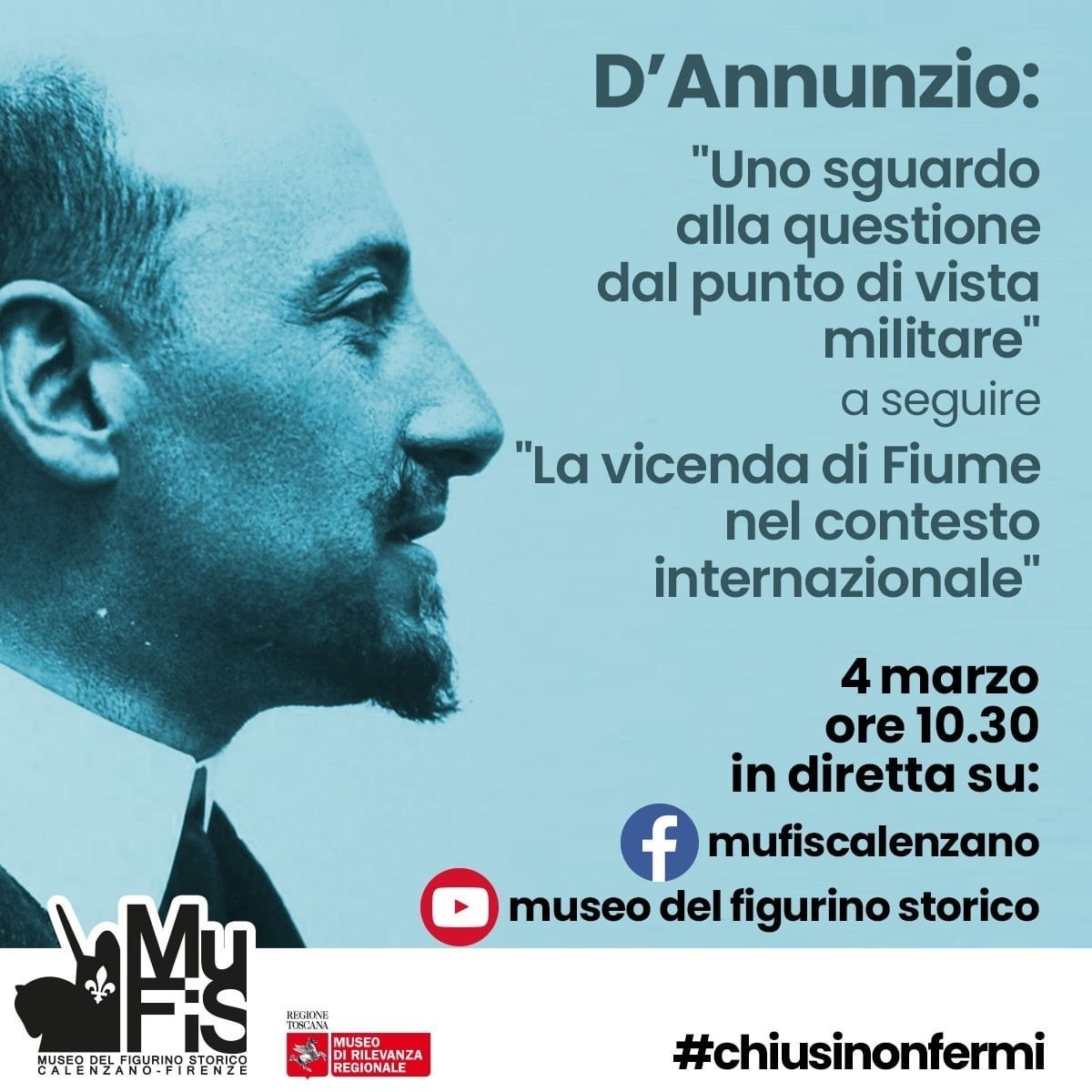 Dal nostro socio Dott. Alessandro Pratesi, collezionista e studioso di documenti storici, memorabilia, storia postale (anche aerea) e filatelia, ci giunge notizia di una questa interessante mostra inaugurata il 18 gennaio 2021 presso il Museo del Figurino Storico di Calenzano (FI), dedicata alla figura di D’Annunzio e accompagnata da una serie di quattro convegni, il primo dei quali si è tenuto lo stesso 18 gennaio, sui canali social del museo: pagina facebook e canale Youtube.
