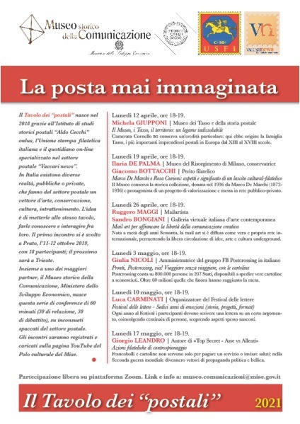 Nell’attesa che, finita la pandemia, ci si possa incontrare nuovamente per il secondo incontro in presenza, dopo quello di Prato del 2019, viene presentata la nuova iniziativa denominata “La posta mai immaginata”, un ciclo di sei conferenze digitali dal 12 aprile (l’appuntamento si rinnoverà ogni lunedì, fino al 17 maggio, tra le ore 18.00 e le 19.00 sulla piattaforma Zoom); è volto a illustrare gratuitamente a tutti gli interessati mille aspetti che caratterizzano il settore. Ad intervenire saranno un gruppo di studiosi che fanno del mondo postale uno strumento d’arte, conservazione, cultura, intrattenimento. Qui sotto è illustrata la locandina con il programma.