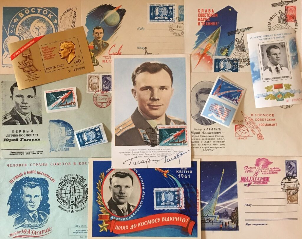 Al rientro Gagarin divenne un’icona nazionale e una celebrità internazionale; la macchina della propaganda sovietica si mise all’opera e naturalmente anche quella filatelica: appena dopo 24 ore dallo sbarco di Yuri Gagarin, il 13 aprile 1961 venne emesso il primo francobollo dell’URSS, seguito poi il 17 da altri due esemplari che celebravano la straordinaria impresa e il suo protagonista e poi dal resto del mondo con centinaia di francobolli commemorativi del primo uomo nello spazio.