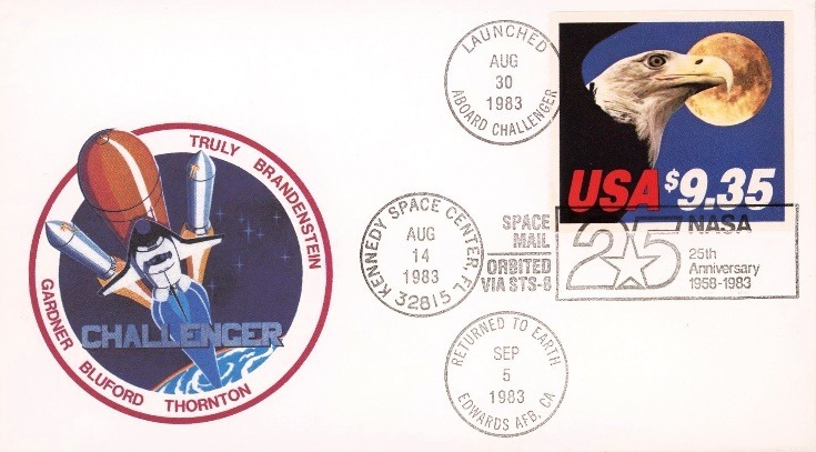 Figura 9 – Cosmogramma Shuttle STS-8 Challenger, 25° anniversario della NASA, affrancato con $9,35 e annulli speciali a data del primo trasporto postale ufficiale nello Spazio, lanciato in orbita dal Kennedy Space Center il 30.8.1983 e ritornato sulla Terra il 5.9.1983.