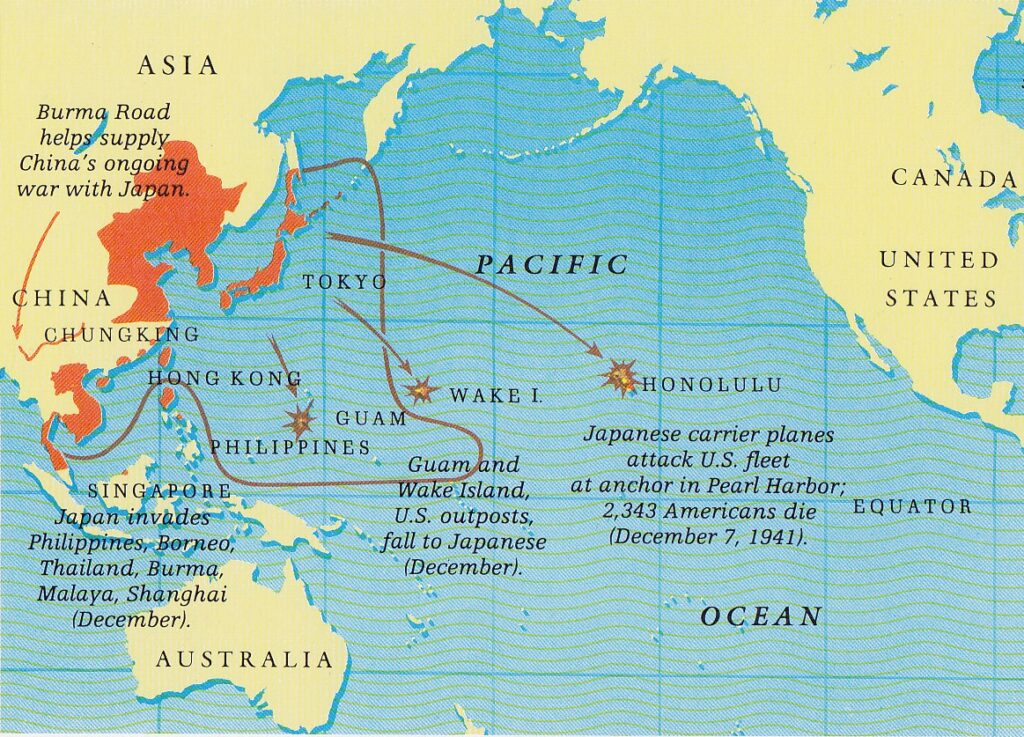 La guerra era iniziata da due anni. L’anno prima, nel 1940, il Giappone aveva firmato un’alleanza difensiva con l’Italia e la Germania nazista. Alla fine del 1941, mentre in Europa la Germania nazista portava avanti la sua offensiva contro l’Unione Sovietica arrivando alle porte di Mosca, il Giappone stava continuando la sua aggressiva politica di espansione nel sud-est asiatico, iniziata già a partire dagli anni Trenta con la conquista della Manciuria, da sempre contesa con la Cina, tra il 1931 e il 1932, e che continuava, tra il 1940 e 1941, con la minaccia alle principali colonie occidentali nell’area (come l’attuale Malesia, allora britannica, o le Indie Orientali olandesi), dopo aver già occupato l’Indocina francese.