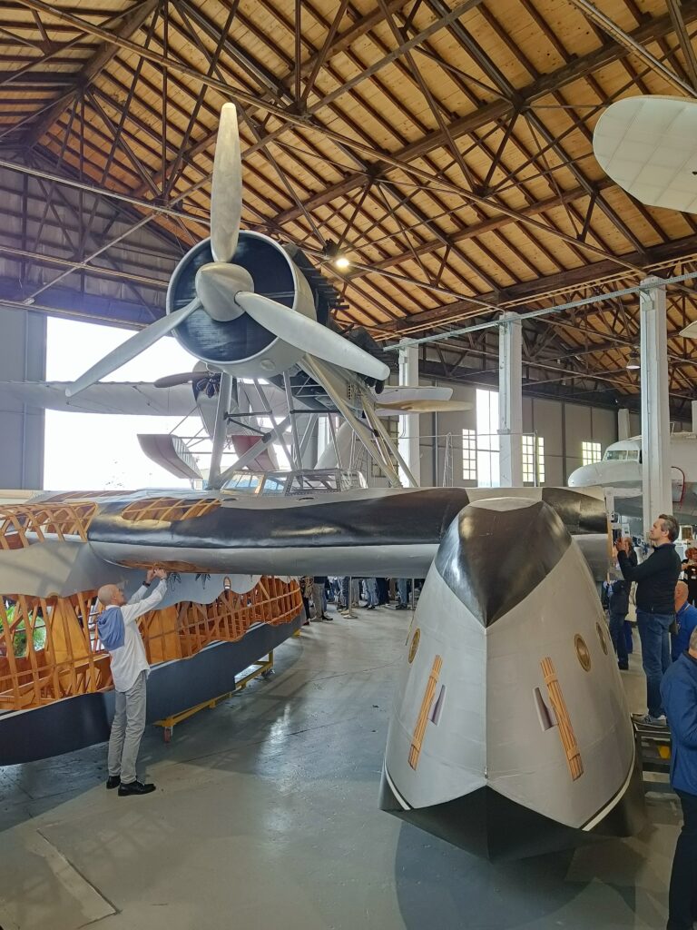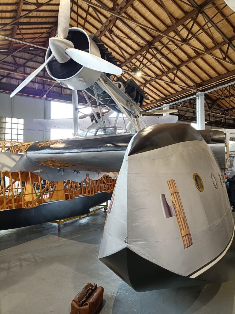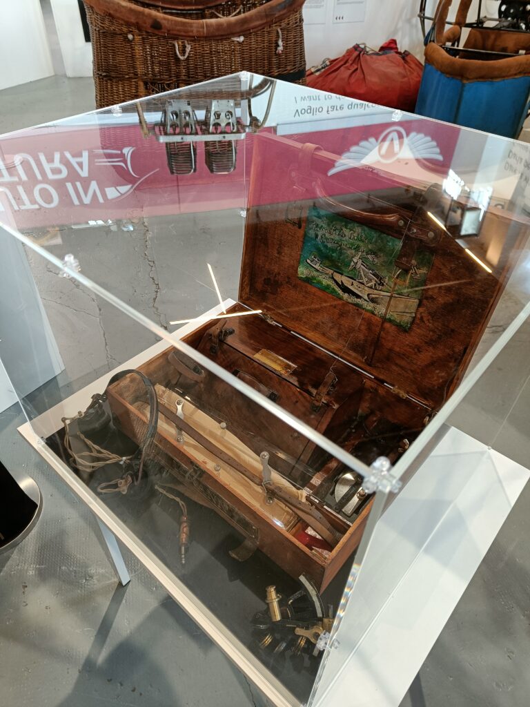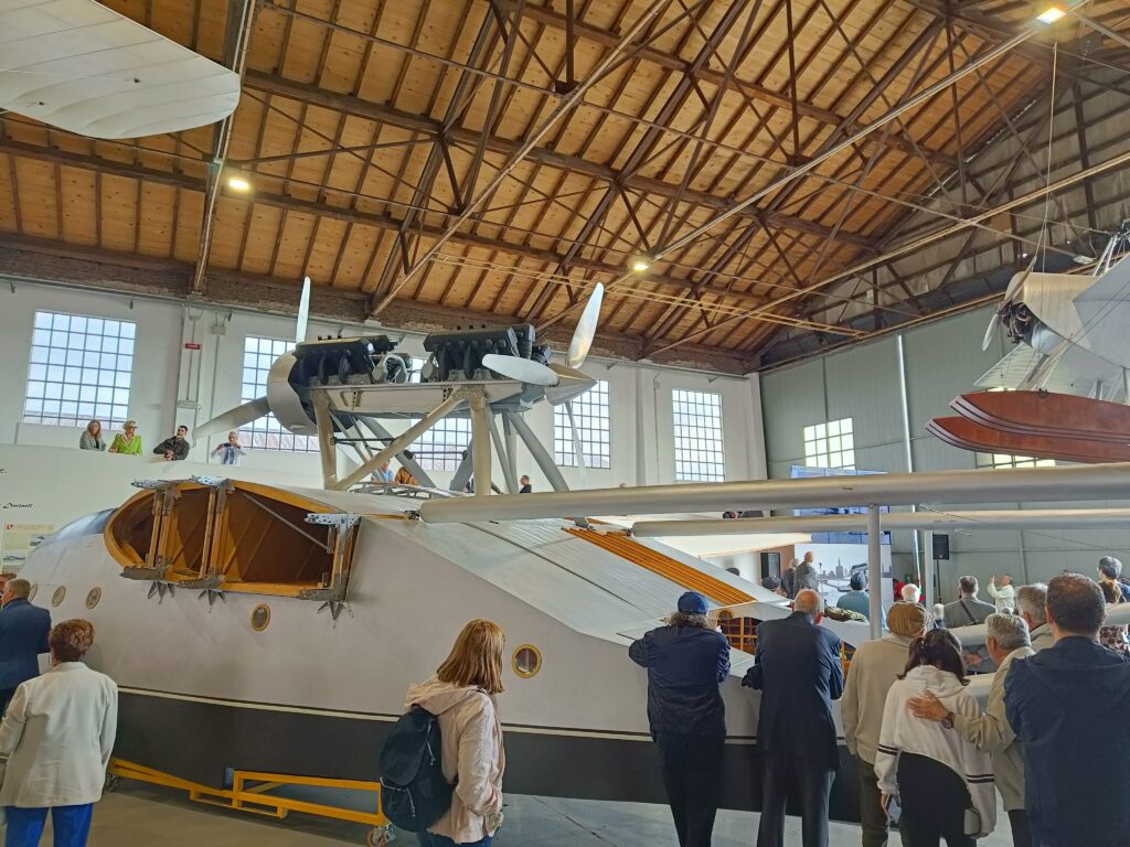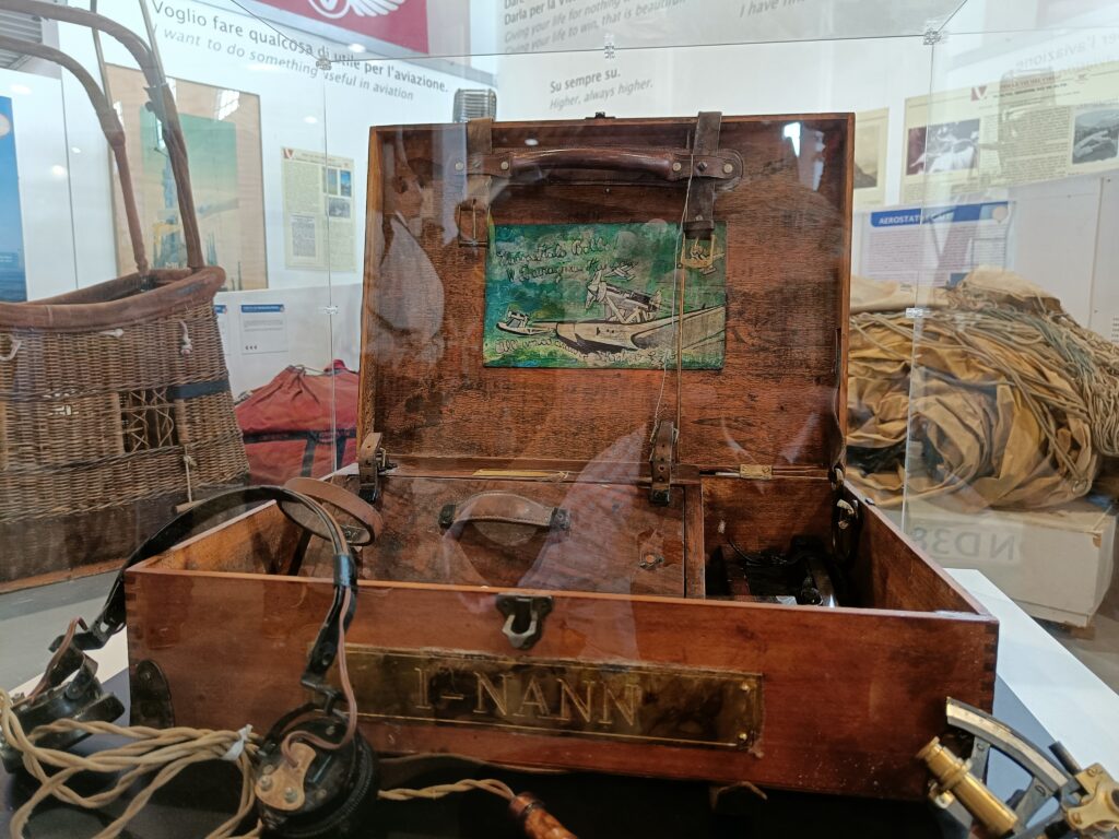 Nel padiglione, accanto all’idrovolante, vi era anche un’esposizione di cimeli e tra questi, in particolare, la valigia di Ezio Vaschetto, messa a disposizione dal nostro socio Luigi Farina e già descritta in un articolo pubblicato su AIDAFlash n. 165 del 2020. Ezio Vaschetto era un radiotelegrafista che nella Crociera del Decennale era a bordo dell’I-NANN. Come si può vedere dalle foto, essa contiene diversi strumenti di volo. Inoltre, faceva bella mostra anche la bella collezione, sempre dedicata alla crociera suddetta, del nostro socio Giorgio Moretti.