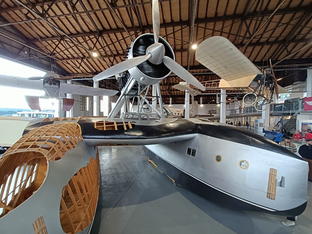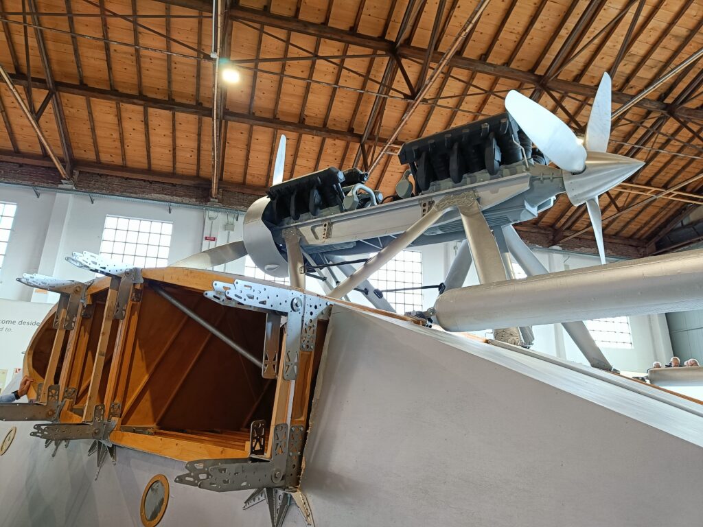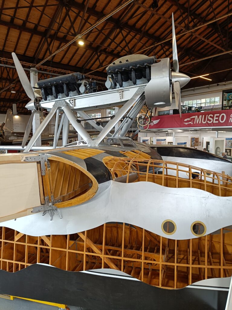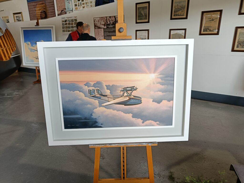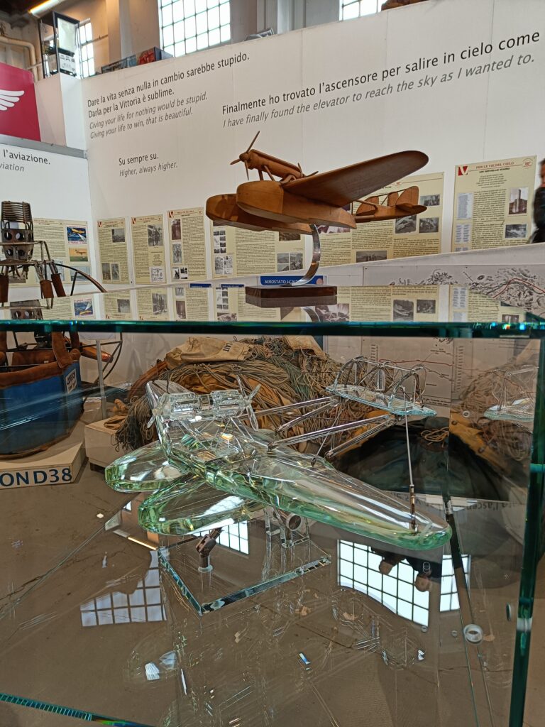 Nel padiglione, accanto all’idrovolante, vi era anche un’esposizione di cimeli e tra questi, in particolare, la valigia di Ezio Vaschetto, messa a disposizione dal nostro socio Luigi Farina e già descritta in un articolo pubblicato su AIDAFlash n. 165 del 2020. Ezio Vaschetto era un radiotelegrafista che nella Crociera del Decennale era a bordo dell’I-NANN. Come si può vedere dalle foto, essa contiene diversi strumenti di volo. Inoltre, faceva bella mostra anche la bella collezione, sempre dedicata alla crociera suddetta, del nostro socio Giorgio Moretti.