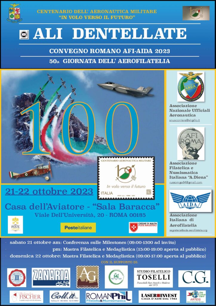 La manifestazione, denominata “Ali Dentellate”, intende commemorare il Centenario dell’Aeronautica Militare, ed è caratterizzata da due importanti eventi: Convegno AFI-AIDA 2023 e 50ª Giornata dell’Aerofilatelia, aventi entrambi ad oggetto le tappe miliari che hanno caratterizzato lo sviluppo dell’Arma Aeronautica nei suoi cento anni di storia.