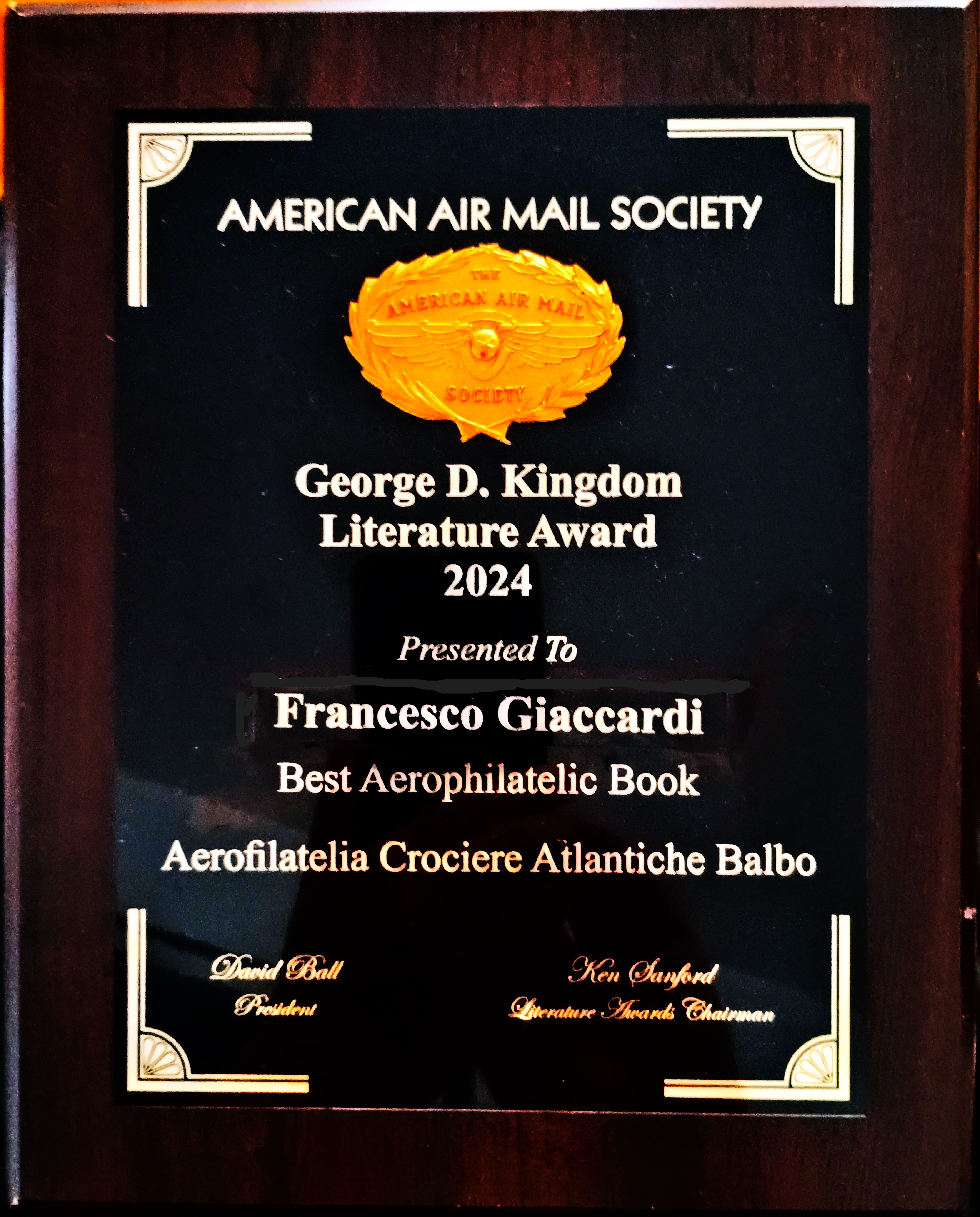 Ci è giunta la bella notizia del prestigioso premio “George D. Kingdom Award 2024” attribuito dall’American Air Mail Society degli Usa al nostro socio Francesco Giaccardi, a cui facciamo i complimenti, per il suo libro “Aerofilatelia Crociere Atlantiche Balbo”, quale miglior pubblicazione Internazionale di Aerofilatelia.