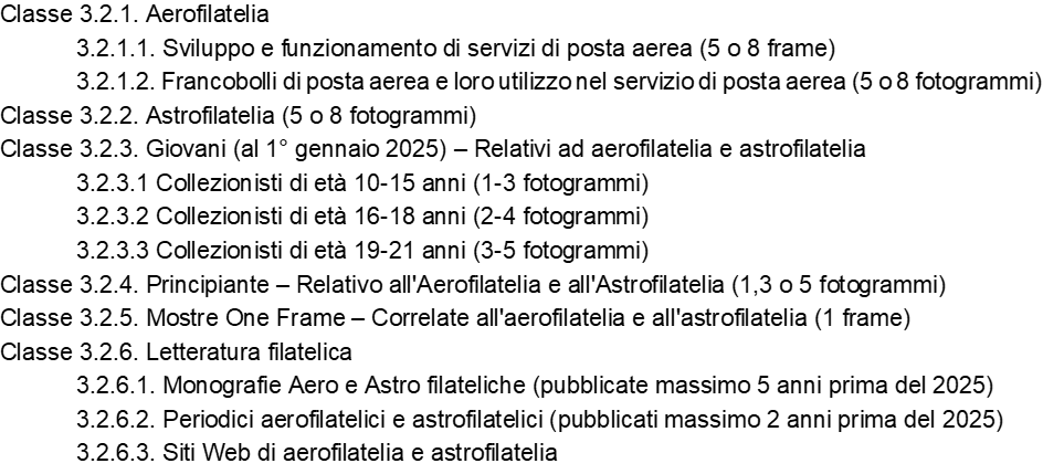 La partecipazione è aperta agli espositori membri di associazioni filateliche affiliate alle Federazioni membri della FIP o alle associazioni membri della FISA. Quindi, potenzialmente, tutti i nostri soci in regola con il pagamento della quota. Ma per le partecipazioni nelle Classi 3.2.1, 3.2.2, 3.2.3.2 e 3.2.3.3 e 3.2.5 la qualificazione minima richiesta è di 75 punti o medaglia Vermeil a livello nazionale o 70 punti o medaglia d’argento grande a livello internazionale negli ultimi cinque anni. Per le partecipazioni nella classe 3.2.6 non è invece richiesta la suddetta prequalificazione.