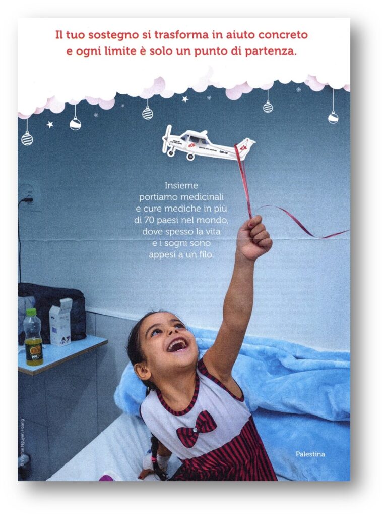 Veniamo dunque agli immancabili auguri di Buon Natale e felice Anno Nuovo, che quest’anno vogliamo condividere attraverso le grandi attività, ma che possiamo anche definire “imprese”, dei MEDICI SENZA FRONTIERE, utilizzando il volto di questa bambina palestinese, per trasmettere a tutti un grande messaggio di pace.