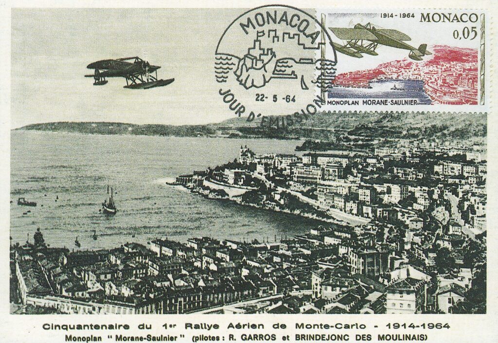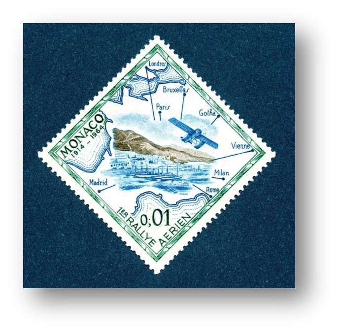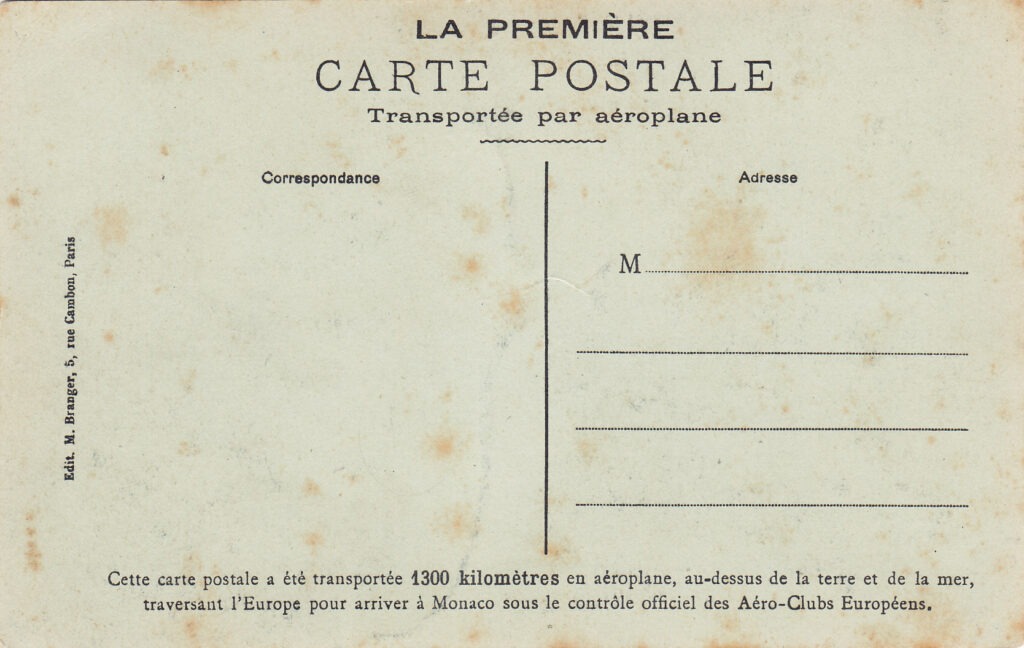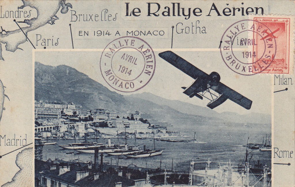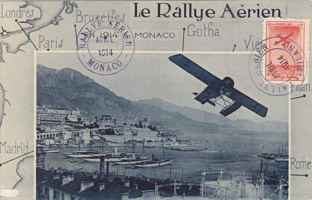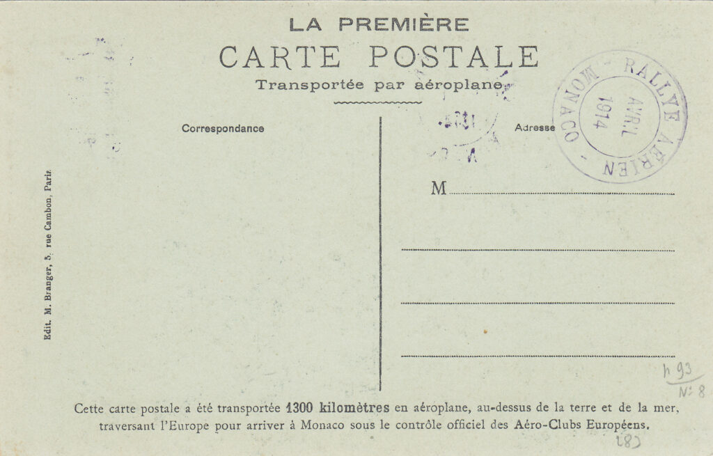 In each of the seven cities of departure, a thousand postcards were loaded onto the participating aircraft, stamped with only the sticker, stamped with a circular rubber cachet, violet, with the inscription “Rallye Aérien / Avril 1914 / name of the city of departure”. Both postcards transported by air and those forwarded by surface received the same circular cachet on arrival but with the word “Monaco” instead of the name of the city of departure. It should be remembered that the same postcards with the stamped vignette exist in Rome, despite the fact that this city was only one stop on route no. 6 and that the distance between Rome and Munich did not reach the 1,300 kilometers prescribed by the regulation.