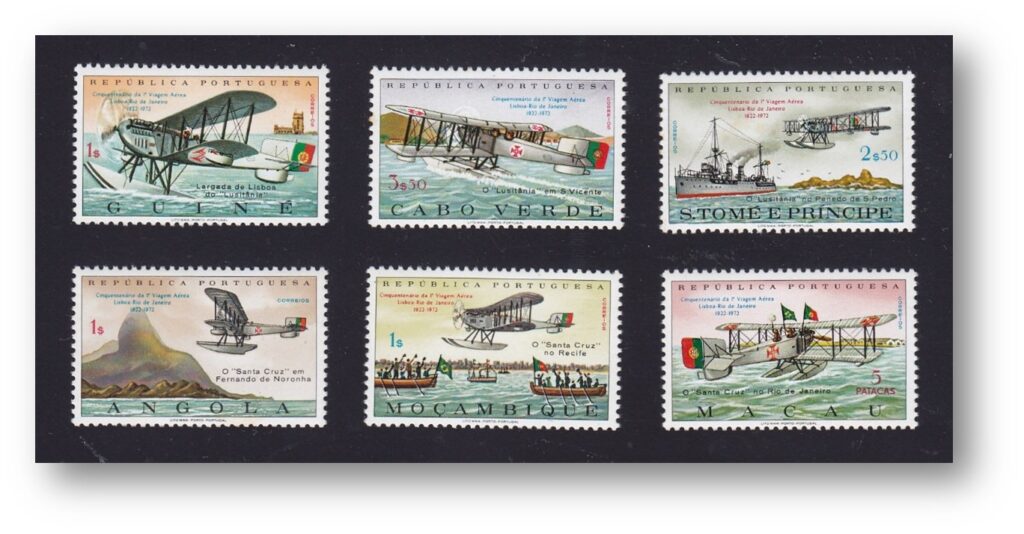 The three stamps issued on 30 March show the three aircraft used. The first, the seaplane Fairey IIID version Mark II, F 400, called “Lusitania”, which took off from Lisbon on March 30, 1922, at dawn; the second, the Fairey IIID seaplane, F 401, license plate 16, which drifted on 11 May after an emergency landing while being rescued by a merchant ship; the third, the Fairey IIID seaplane, F402, with license plate 17, which completed the crossing on June 17, 1922 and was later christened “Santa Cruz” upon arrival in Brazil.