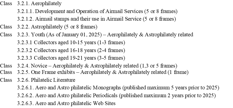 Participation is open to exhibitors who are members of philatelic associations affiliated with Federations that are members of the FIP, or with associations that are members of FISA. Therefore, potentially, all our members who are up to date with their membership fees can participate. However, for entries in Classes 3.2.1, 3.2.2, 3.2.3.2, 3.2.3.3, and 3.2.5, the minimum qualification required is 75 points or a Vermeil medal at the national level, or 70 points or a large silver medal at the international level in the last five years. No such prequalification is required for participation in Class 3.2.6.